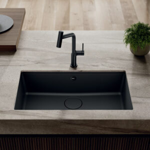 Zem darbvirsmas pabūvējama Fragranit® akmens masas izlietne matēti melnā tonī ar pieskaņotu melnu furnitūru. 2 līmeņu vanniņa funkcionālu piederumu ievietošanai Fragranit+ materiāls ar Sanitized antibakteriālu aizsardzību
