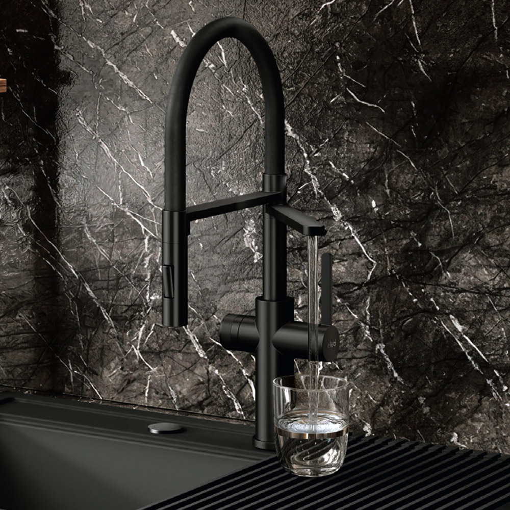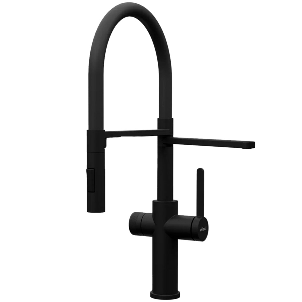Jaunā kolekcija ,Matēti melns krāns virtuves izlietnei no itāļu ražotāja Elleci ar racionālu funkciju apvienojumu, trīs vienā: